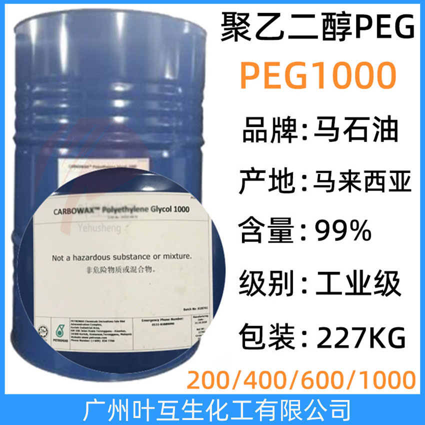 依分子量不同而性質(zhì)不同,從無(wú)色無(wú)臭黏稠液體至蠟狀固體。分子量200~600者常溫下是液體,分子量在600以上者就逐漸變?yōu)榘牍腆w狀,隨著平均分子量的不同,性質(zhì)也有差異。從無(wú)色無(wú)臭粘稠液體至蠟狀固體。隨著分子量的增大,其吸濕能力相應(yīng)降低。本品溶于水、乙醇和許多其它有機(jī)溶劑。蒸氣壓低,對(duì)熱、酸、堿穩(wěn)定。與許多化學(xué)品不起作用。有良好的吸濕性、潤(rùn)滑性、粘結(jié)性。無(wú)毒,無(wú)刺激。平均分子量300,n=5~5.75,熔點(diǎn)-15~8℃,相對(duì)密度1.124~1.130。平均分子量600,n=12~13,熔點(diǎn)20 ~25℃,閃點(diǎn)246℃,相對(duì)密度1.13 (20℃)。平均分子量4000,n=70~85,熔點(diǎn)53~ 56℃。